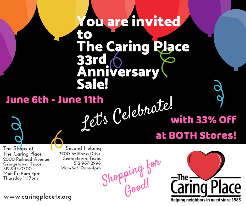 We love celebrating our anniversary and we want to share the joy with you! BOTH shops will have an anniversary sale June 6th-June 11th celebrating The Caring Place organization! We have been around for 33 years! What does that mean to you? June 6th-11th you get 33% off you merchandise!