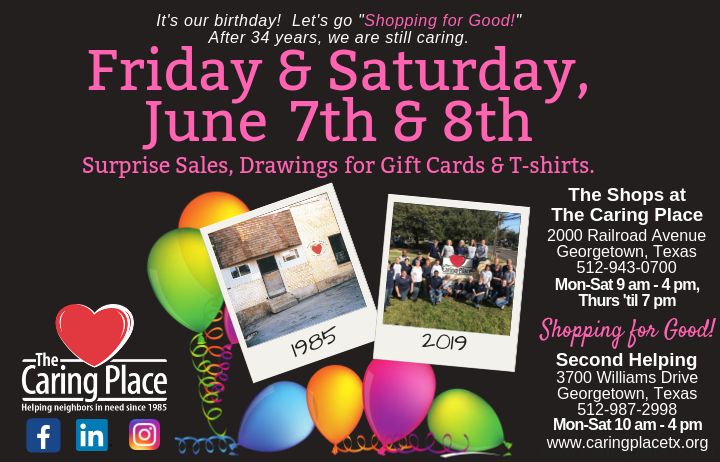 We hope you join us in June for The Caring Place's 34th anniversary on June 7th and 8th! As always, we are celebrating in our stores. Both The Shops at The Caring Place and Second Helping will have surprise sales and drawings as we commemorate 34 years of caring in our community. Help us continue the mission to provide for the basic human needs in our community by "Shopping for Good!"
