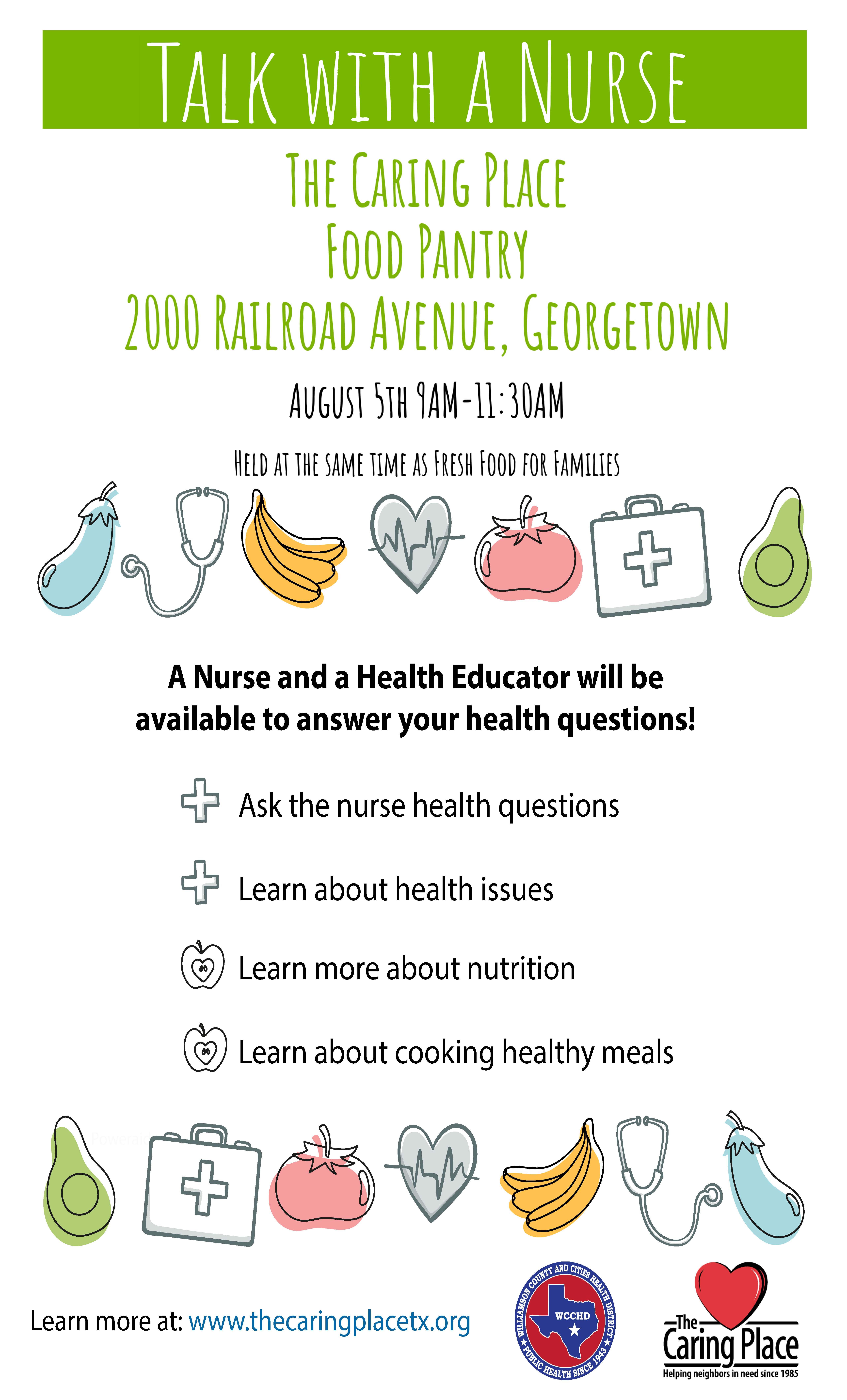 Join Williamson County and Cities Health District at The Caring Place to ask questions about health issues, nutrition and cooking healthy. This Talk with a Nurse come and go event is held at the same time as the Fresh Food for Families event at 2000 Railroad in the drive through, but all are welcome to learn and ask questions. Please come inside to our Food Pantry after you get your produce in the drive through to get involved.