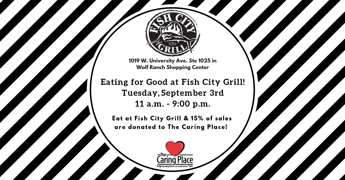 We love Fish City Grill! They host an amazing Eating for Good day for us here and we are honored to be on their schedule this year on September 3rd! All day 15% of your meal purchases benefit The Caring Place! Simply, GO EAT on September 3rd! That's it!